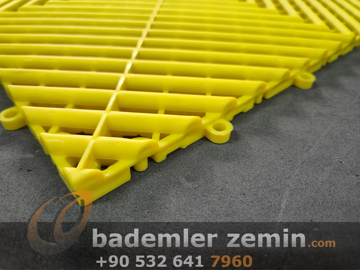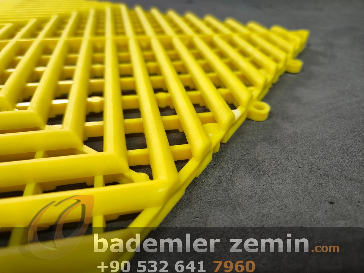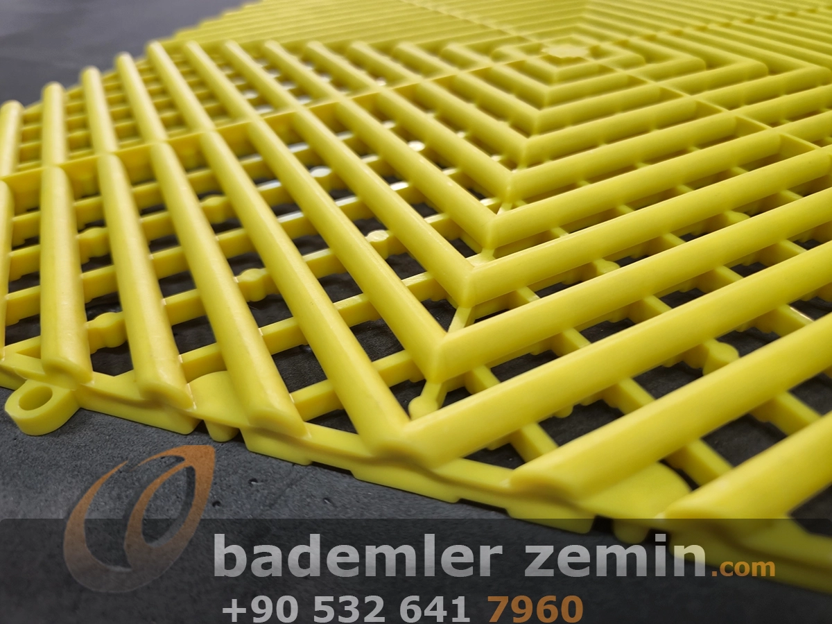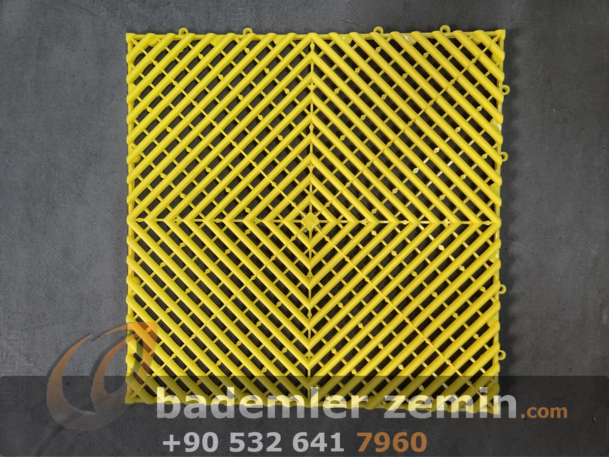Sarı Geçmeli Karo Zemin, Dayanıklı yapısı ve modern görünümüyle dikkat çeker. Farklı renkleriyle ıslak ve yoğun kullanılan alanlar için ideal bir çözümdür. Oto galeriler, oto yıkama istasyonları, tamirhaneler ve showroomlarda hem güvenli hem de şık bir zemin sunar. Altından su geçirebilen yapısı sayesinde zeminlerde su birikimi olmaz, kaymaz yüzeyi ile güvenlik sağlar.