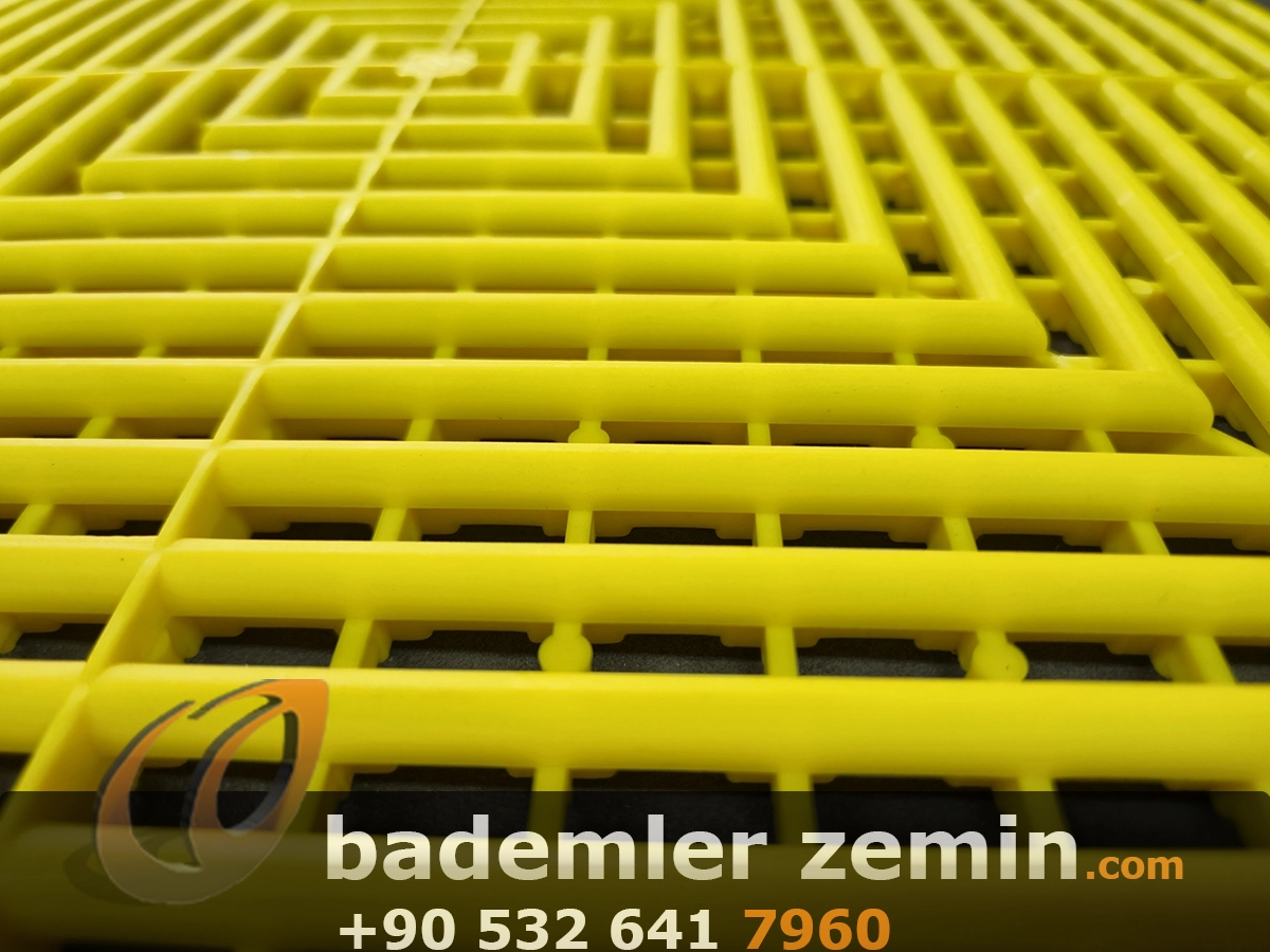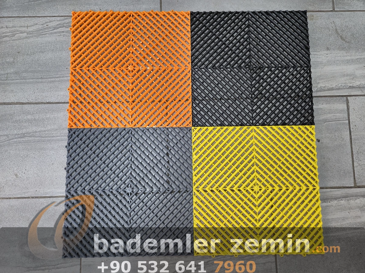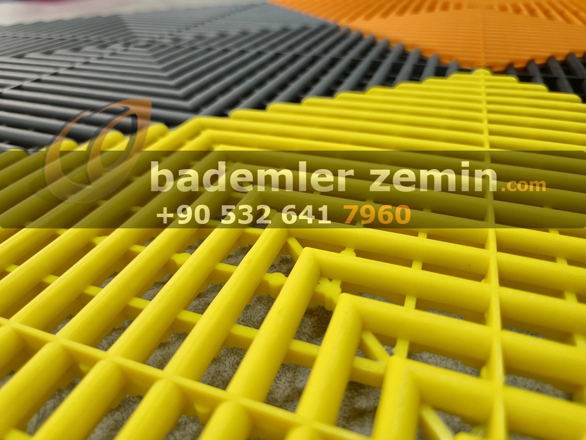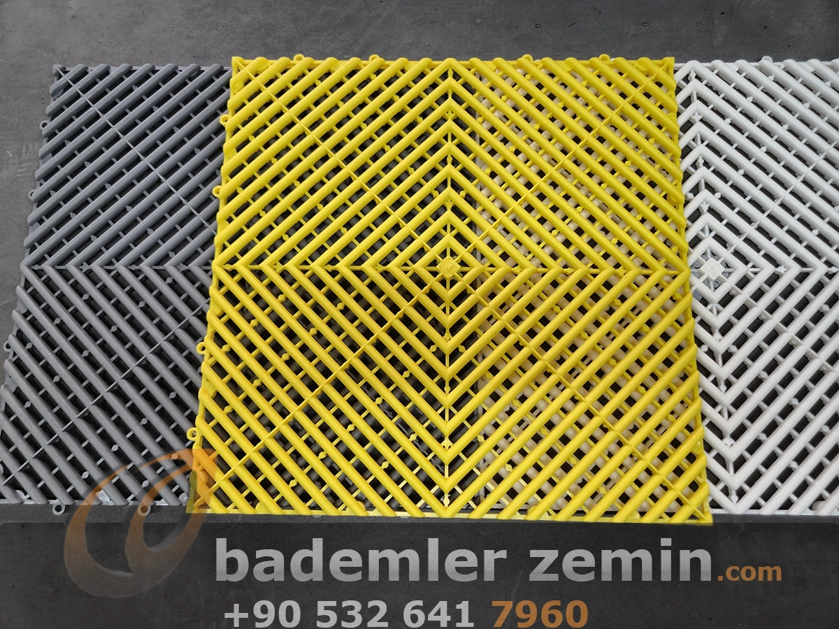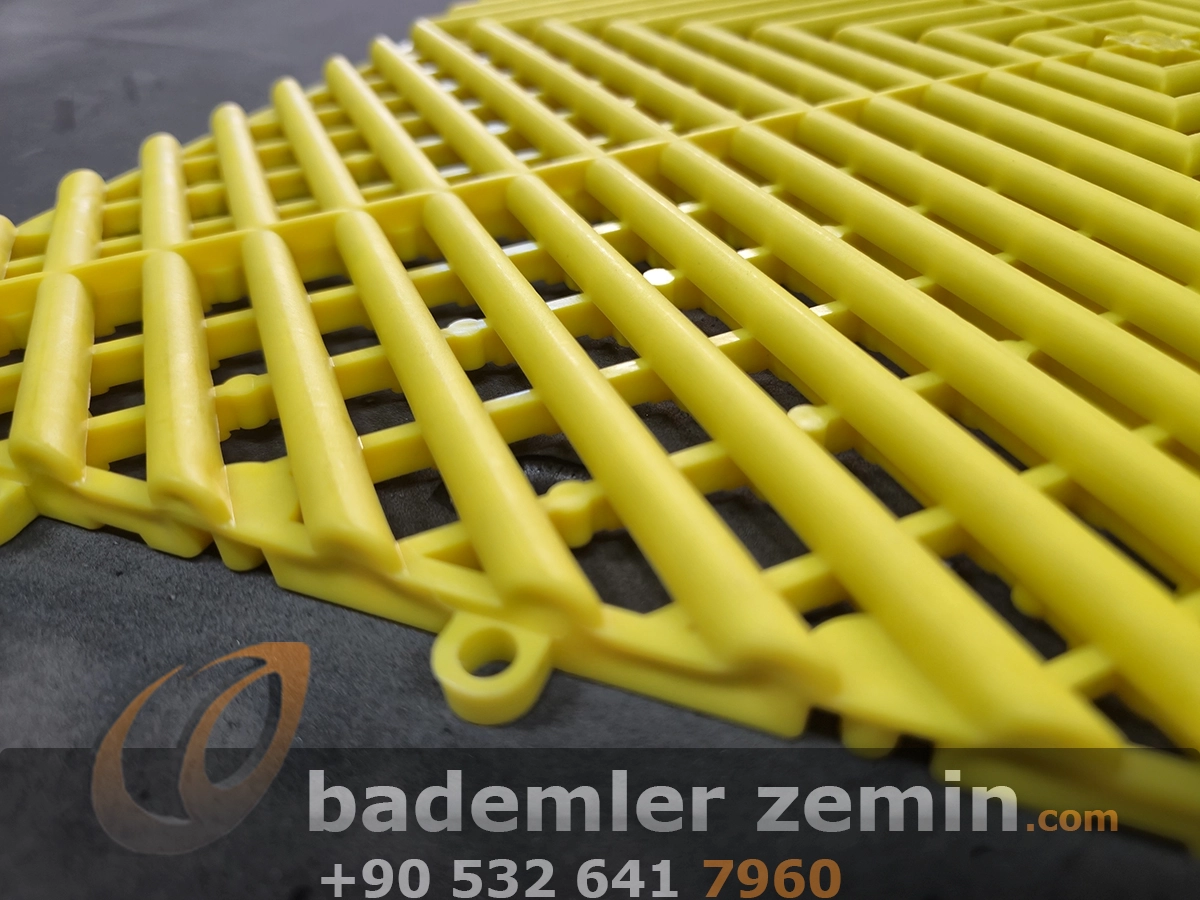 Sarı Geçmeli Karo Zemin, Dayanıklı yapısı ve modern görünümüyle dikkat çeker. Farklı renkleriyle ıslak ve yoğun kullanılan alanlar için ideal bir çözümdür. Oto galeriler, oto yıkama istasyonları, tamirhaneler ve showroomlarda hem güvenli hem de şık bir zemin sunar. Altından su geçirebilen yapısı sayesinde zeminlerde su birikimi olmaz, kaymaz yüzeyi ile güvenlik sağlar.